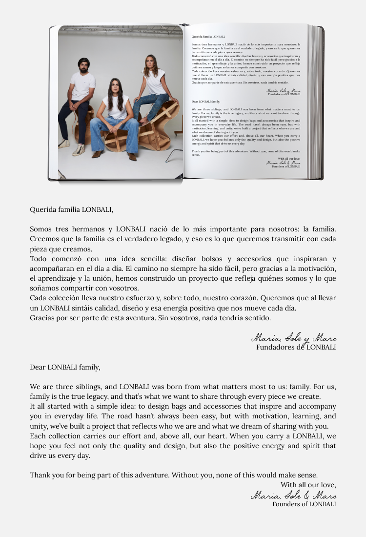 LONBALI nació en 2016 con un propósito claro: romper con lo establecido y crear un universo de diseño donde la moda y la funcionalidad hablen el mismo idioma. Detrás de la marca están María, Sole y Marc, tres hermanos barceloneses con una herencia creativa única y una mirada puesta en el mundo. Hijos de la diseñadora Purificación García, no se conformaron con continuar un legado: decidieron reinventarlo.