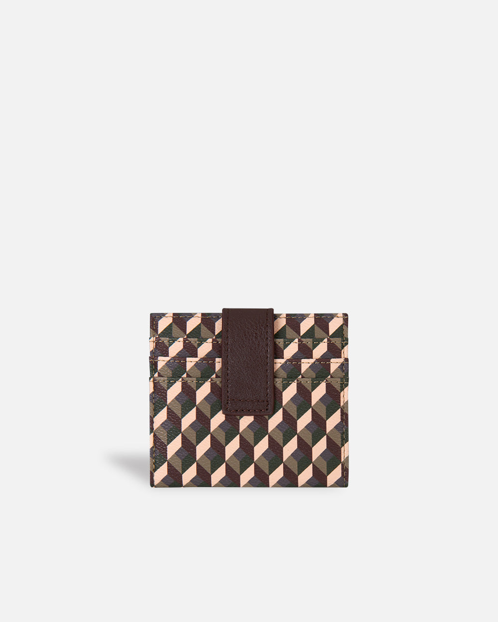 La nueva billetera mediana con print de Lonbali presenta un diseño cuadrado con cierre de pestaña a presión, cuenta con capacidad para seis tarjetas en el interior y otras seis tarjetas en el exterior. Además contiene un bolsillo adicional para billetes. Incluye el logotipo de la marca grabado en el cierre de la parte frontal.