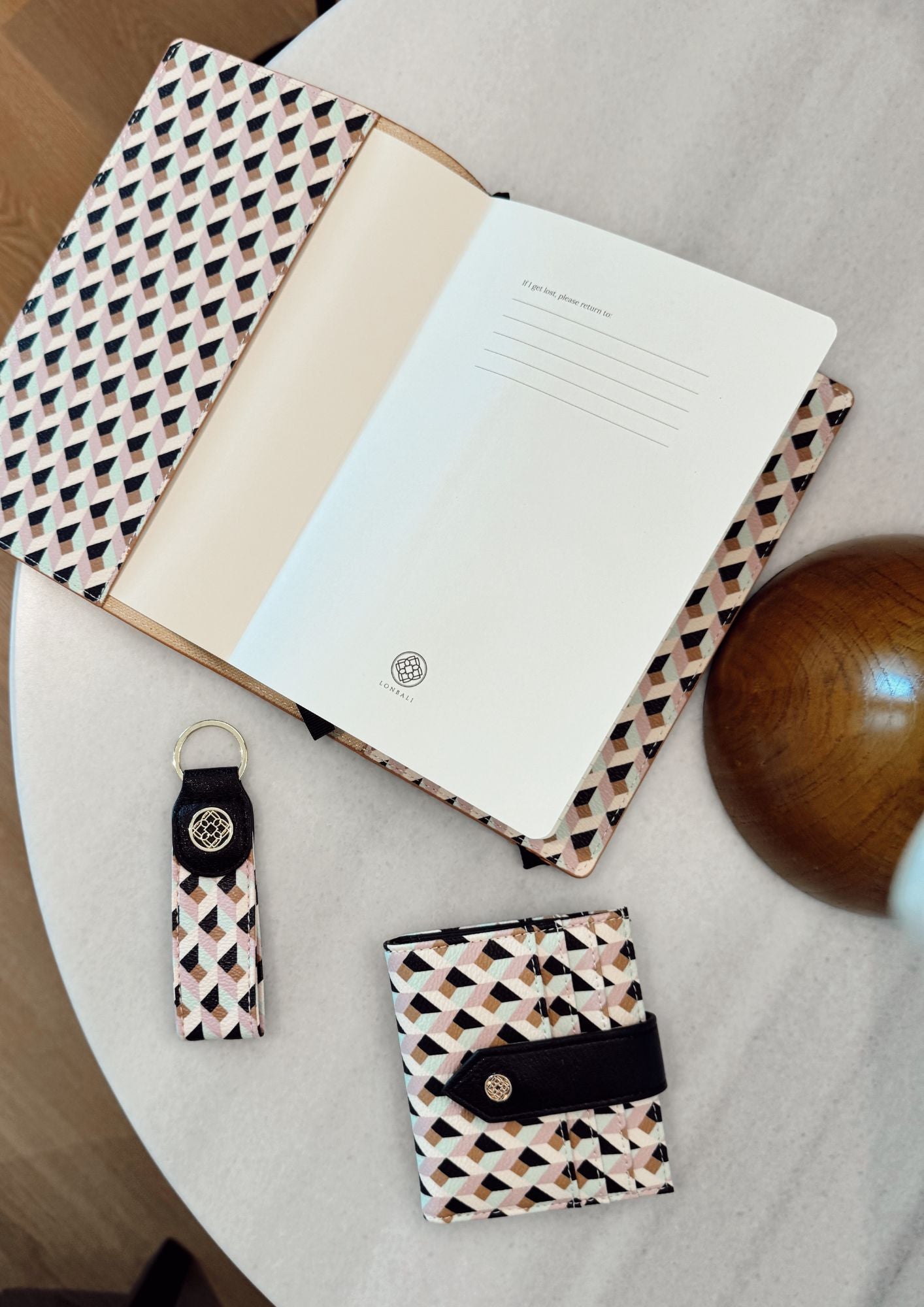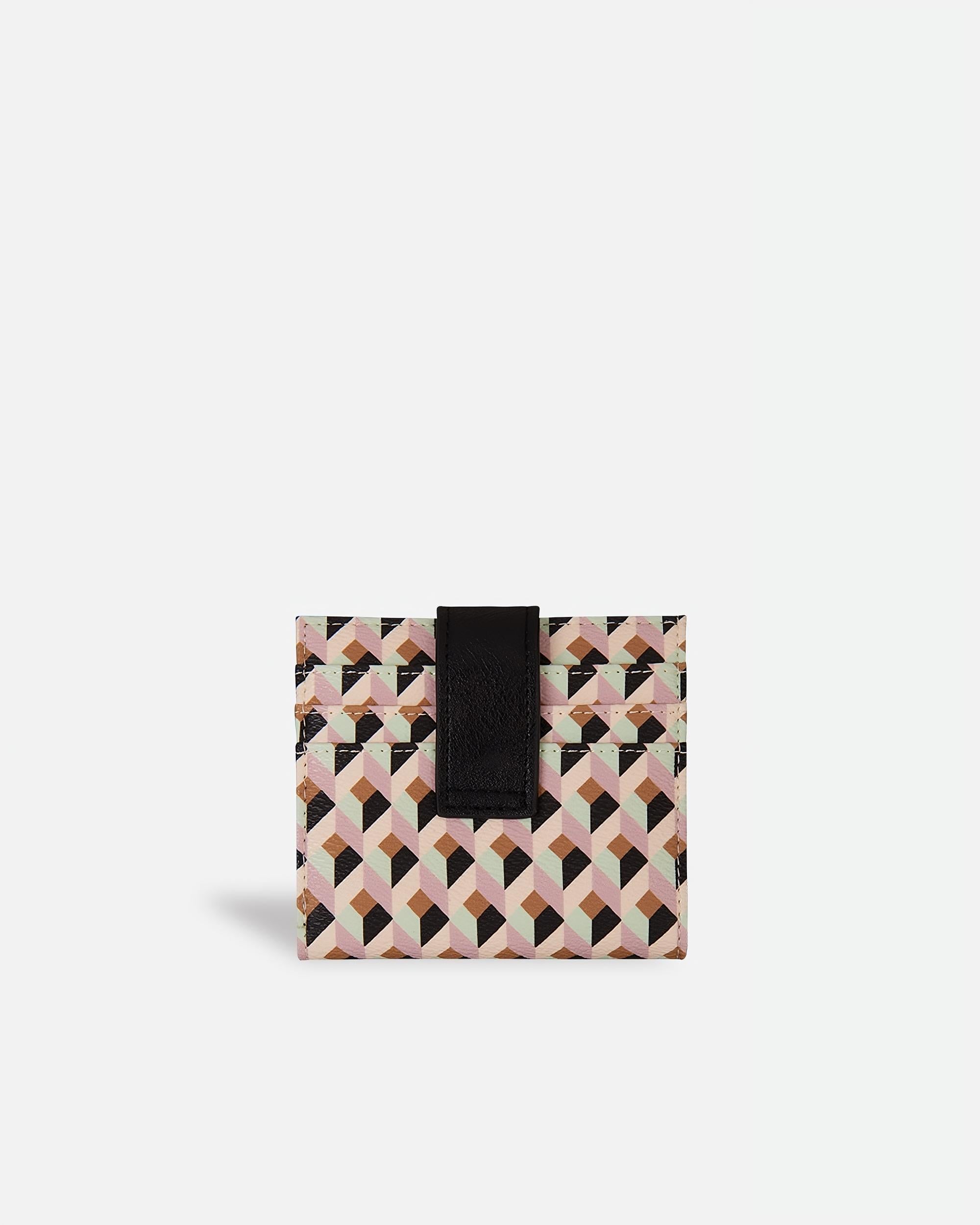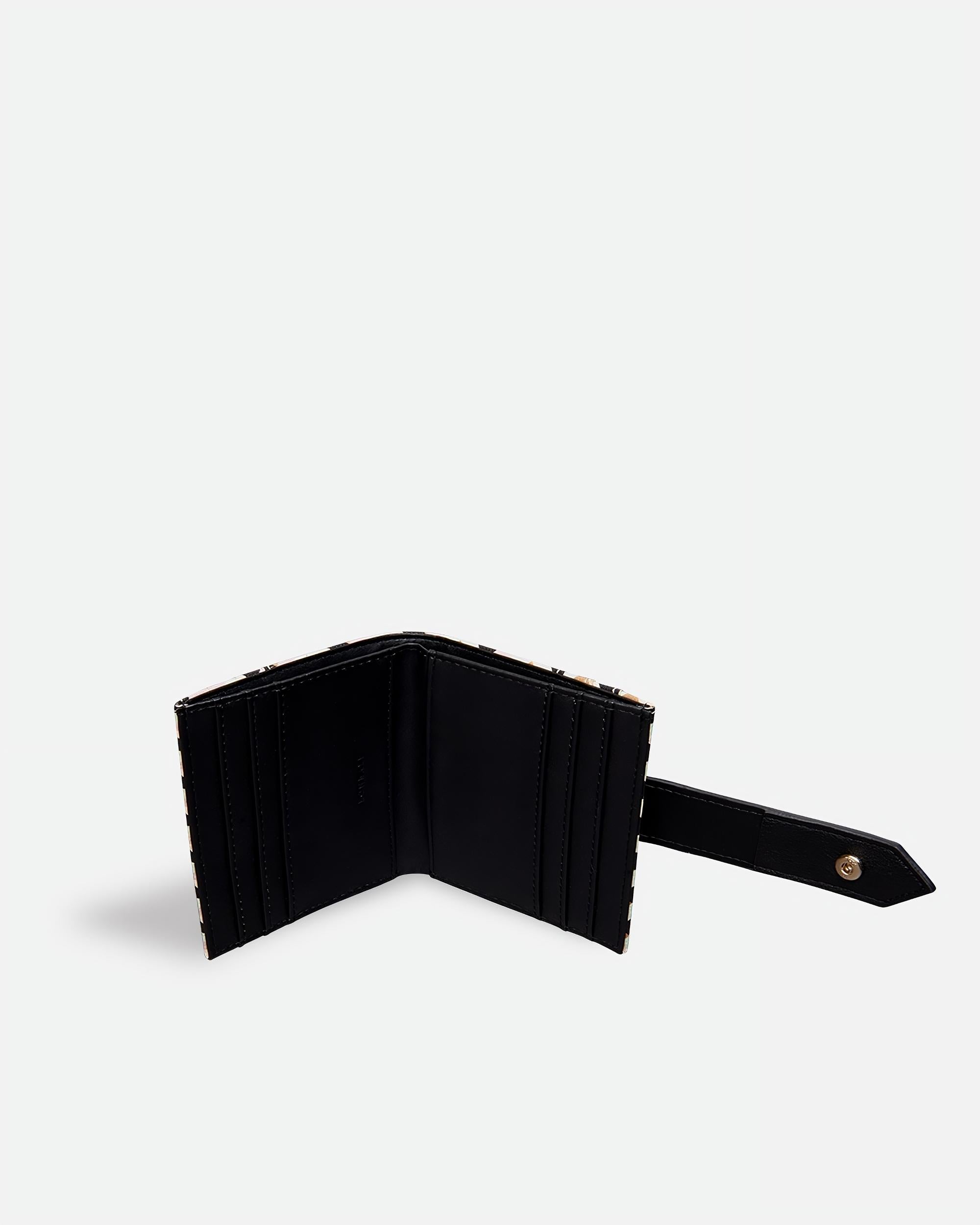 La nueva billetera mediana con print de Lonbali presenta un diseño cuadrado con cierre de pestaña a presión, cuenta con capacidad para seis tarjetas en el interior y otras seis tarjetas en el exterior. Además contiene un bolsillo adicional para billetes. Incluye el logotipo de la marca grabado en el cierre de la parte frontal.