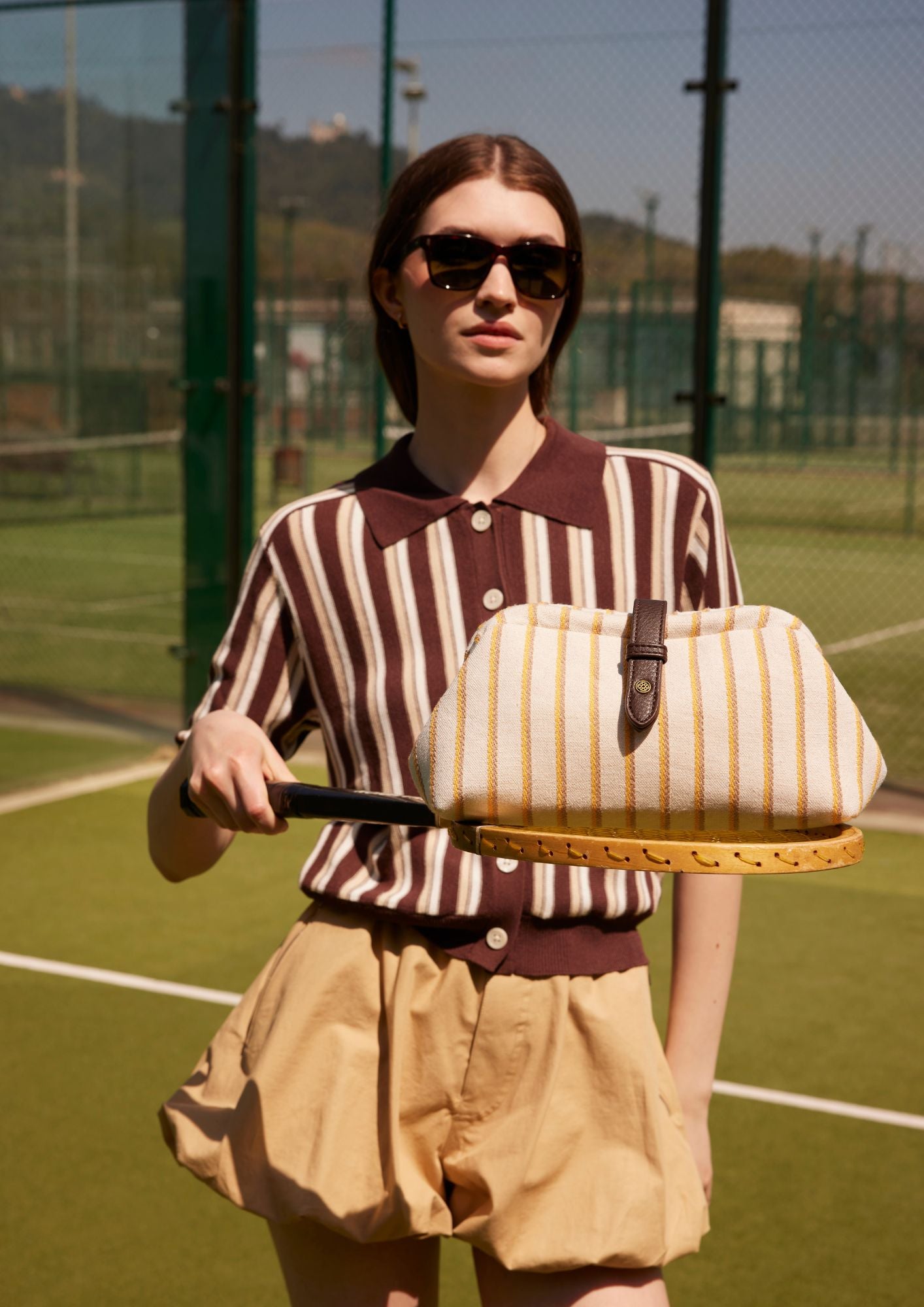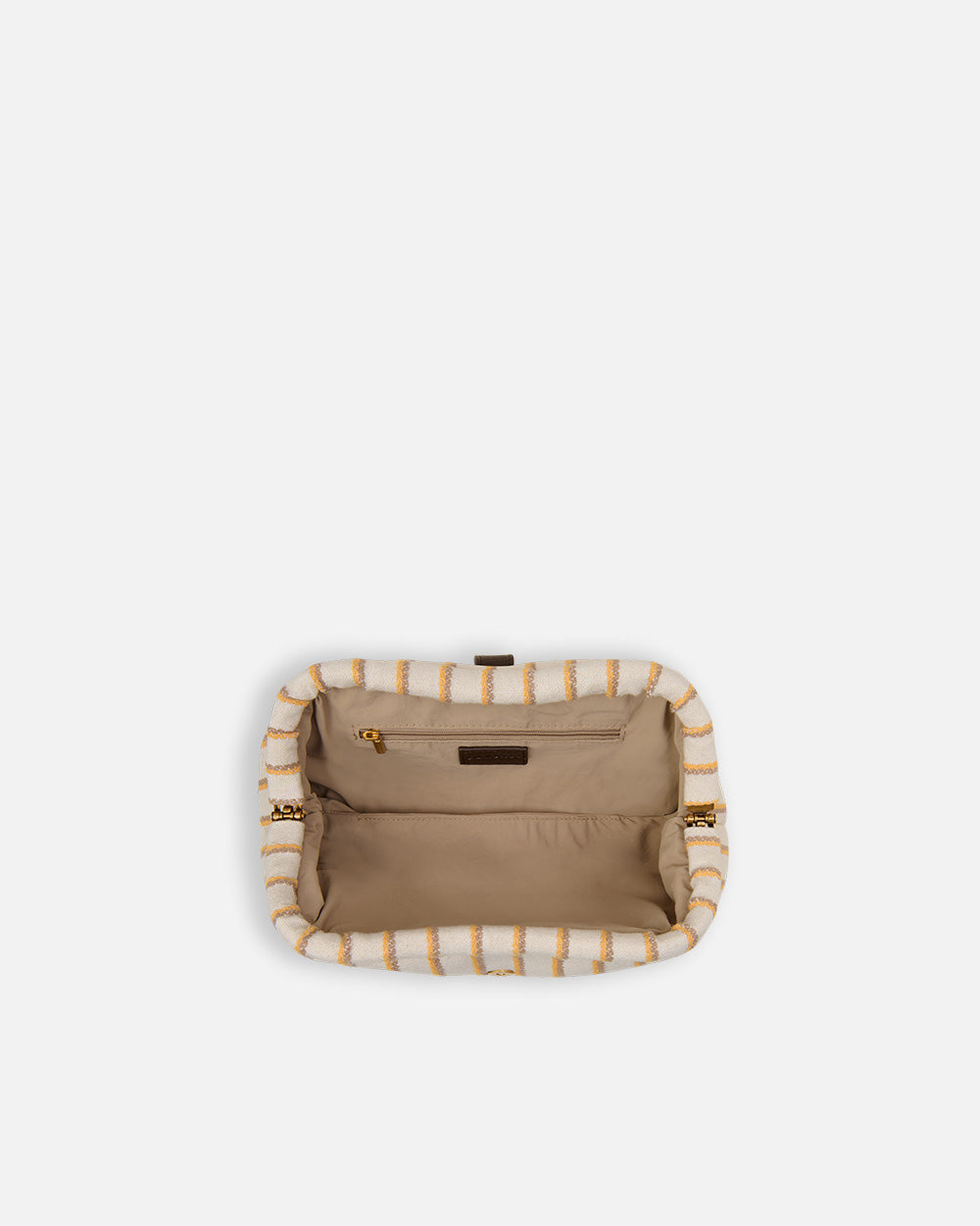 Estilo y funcionalidad en un solo accesorio. Nuevo Bolso Benat Clutch, combina diseño contemporáneo y practicidad en una pieza imprescindible para este verano. Diseñado con un atractivo estampado de rayas verticales en tonos marrones y mostaza sobre fondo crema, este accesorio es perfecto para llevar tus esenciales con estilo.