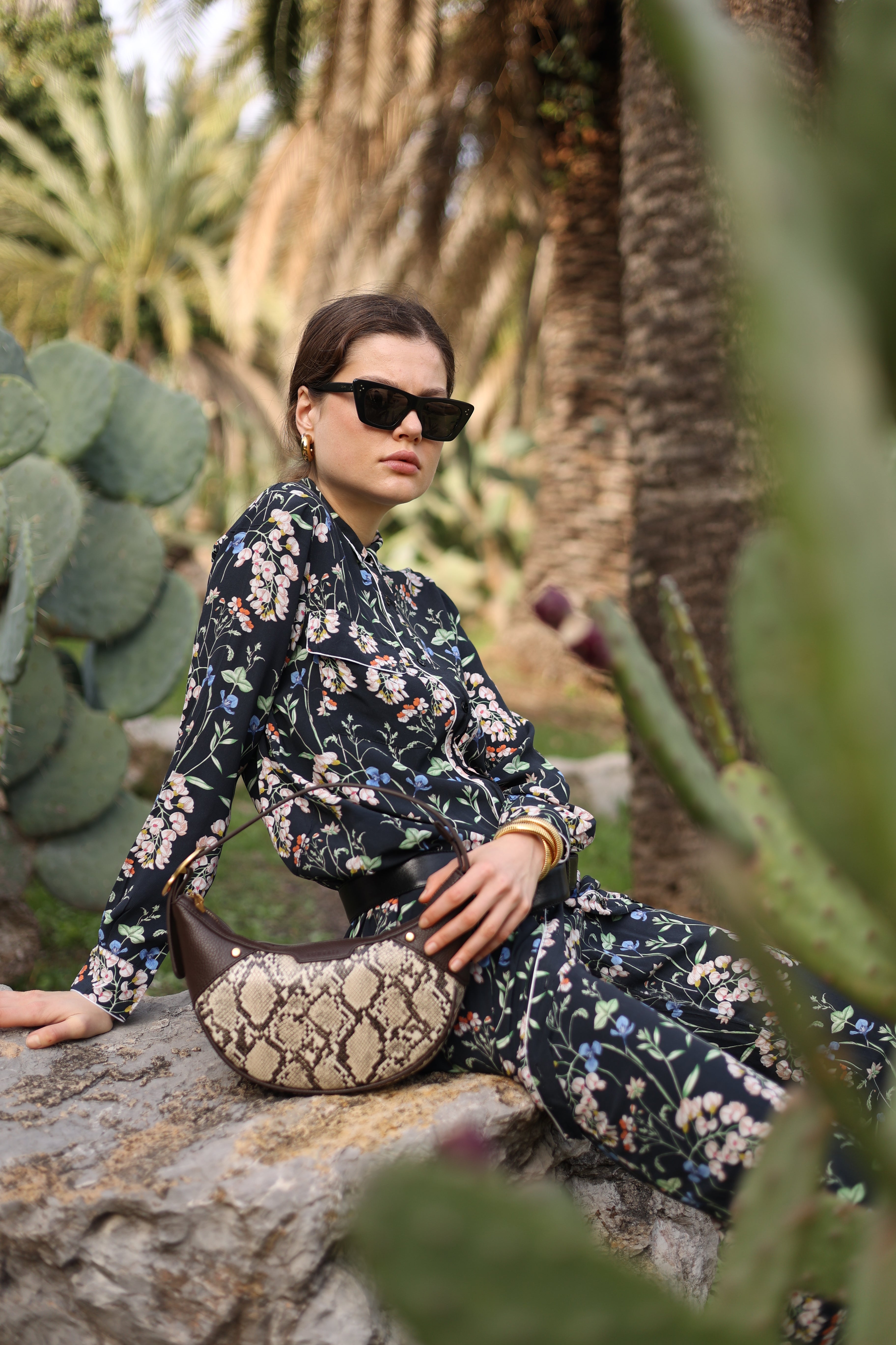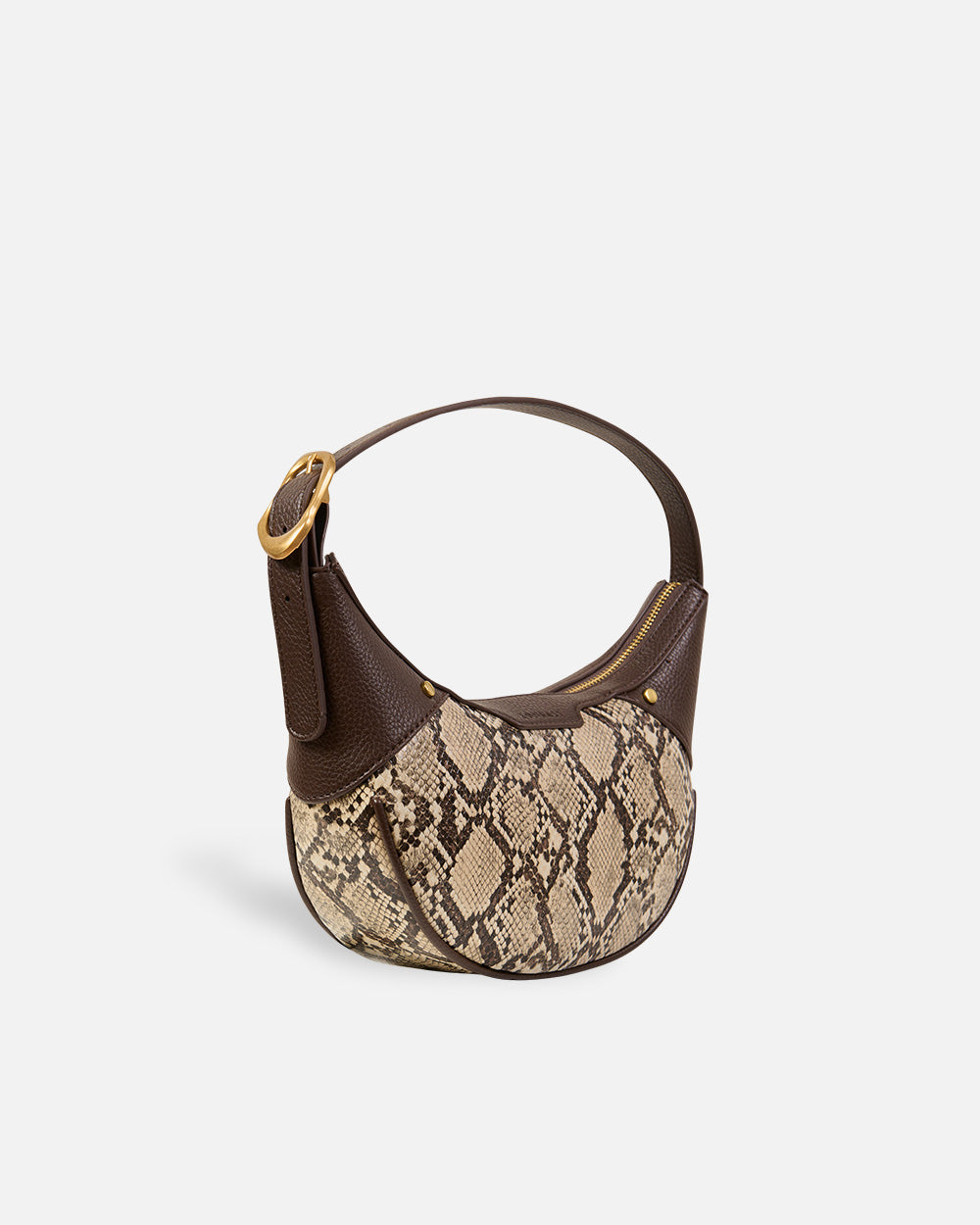 El bolso Halfmoon Snake es un bolso elegante con un diseño sofisticado. Presenta un acabado print con detalles en marrón. Ofrece un estilo natural y único que contrasta con el estampado del bolso. La forma es estructurada pero ligeramente flexible, de un tamaño muy versátil e ideal para uso diario o para complementar looks más formales. Incluye detalles como remaches metálicos en los laterales, añadiendo un toque de diseño funcional.