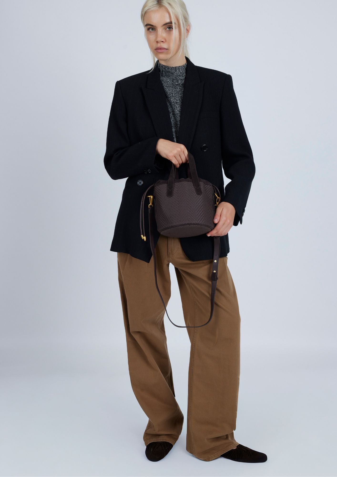El bolso Mini Bucket de Lonbali está pensado para acompañarte con elegancia en tus actividades diarias. Compacto, estructurado y con líneas limpias, fabricado con textura en espiga, aportando un acabado sofisticado y resistente.