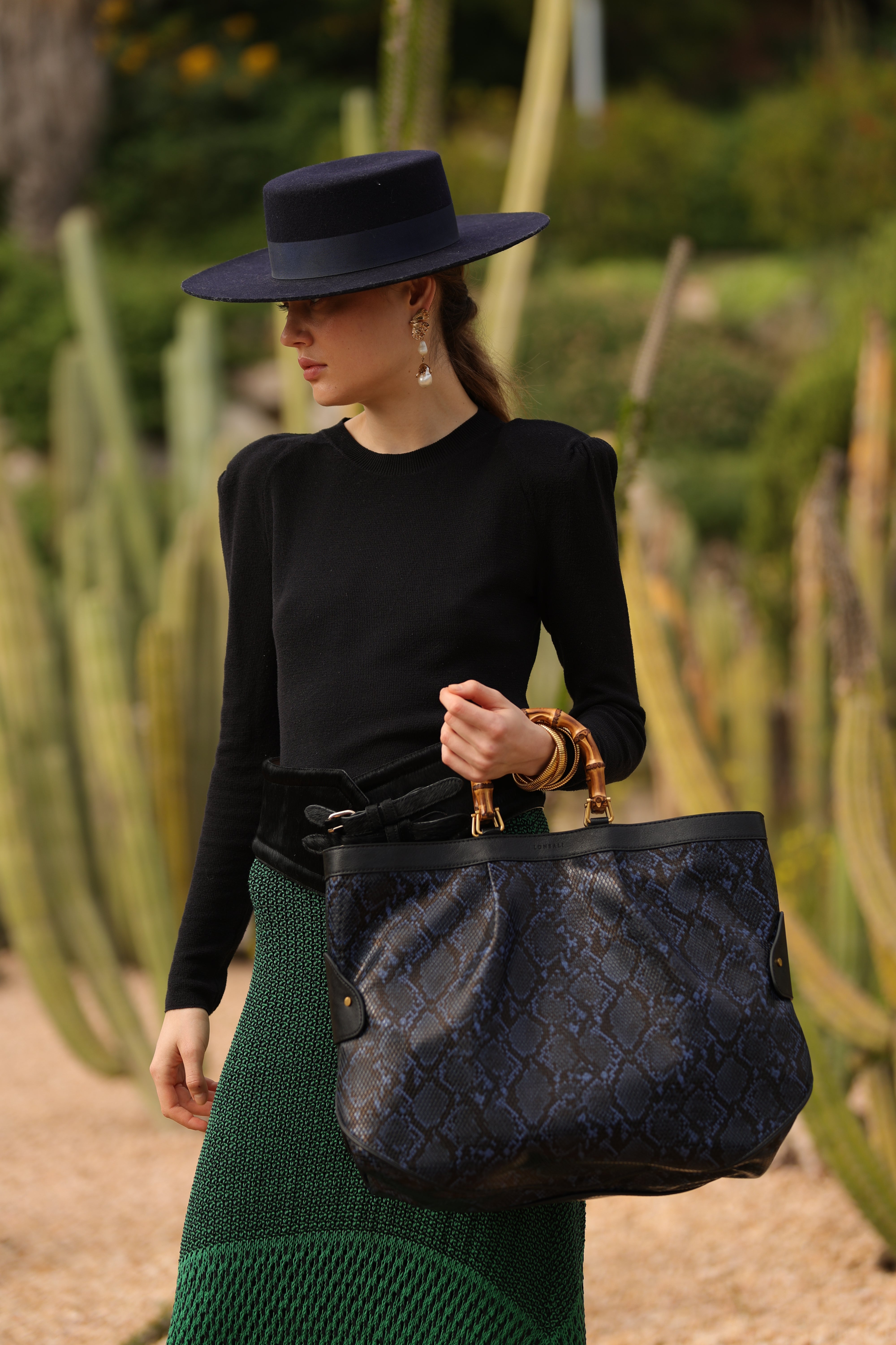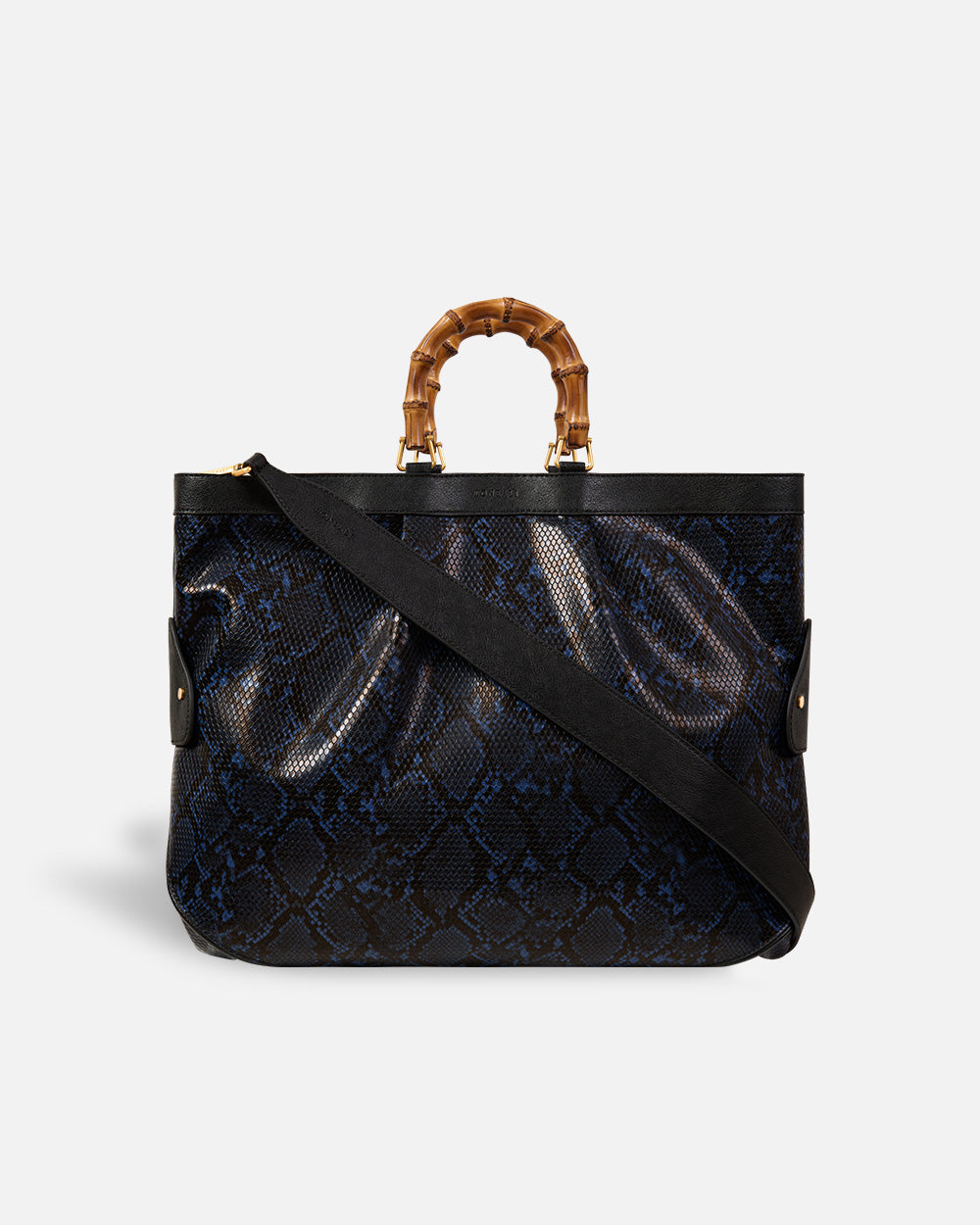 El bolso Large Tote Snake es un elegante bolso de mujer con un diseño sofisticado. Presenta un acabado print con detalles en negro. Las asas están hechas de bambú, ofreciendo un estilo natural y único que contrasta con el estampado del bolso. La forma es estructurada pero ligeramente flexible, ideal para uso diario o para complementar looks más formales. Incluye detalles como remaches metálicos en los laterales, añadiendo un toque de diseño funcional.