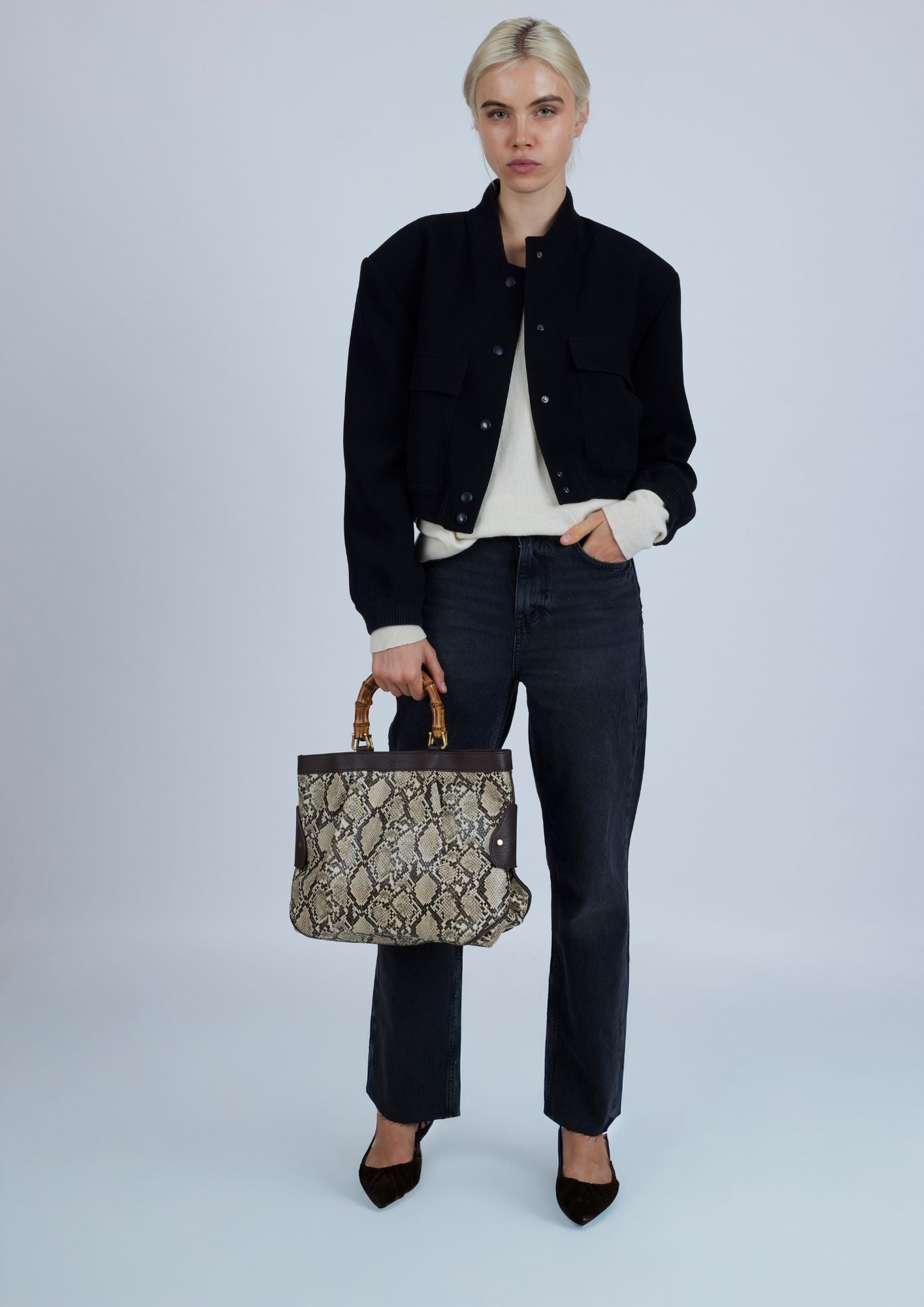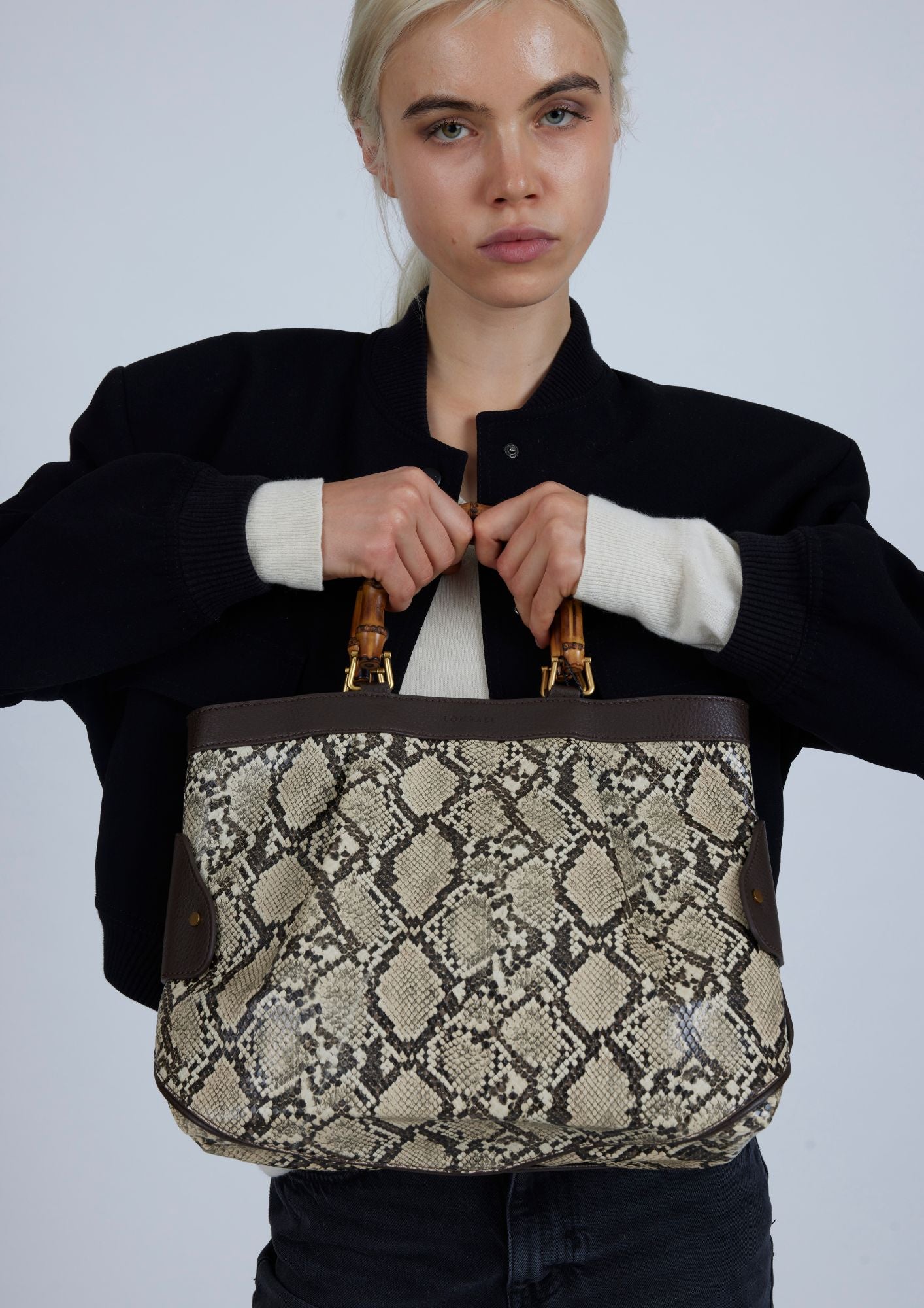El bolso Medium Tote Snake es un bolso de mujer elegante con un diseño sofisticado. Presenta un acabado print con detalles en marrón. Las asas están hechas de bambú, ofreciendo un estilo natural y único que contrasta con el estampado del bolso. La forma es estructurada pero ligeramente flexible, de un tamaño mediano e ideal para uso diario o para complementar looks más formales. Incluye detalles como remaches metálicos en los laterales, añadiendo un toque de diseño funcional.