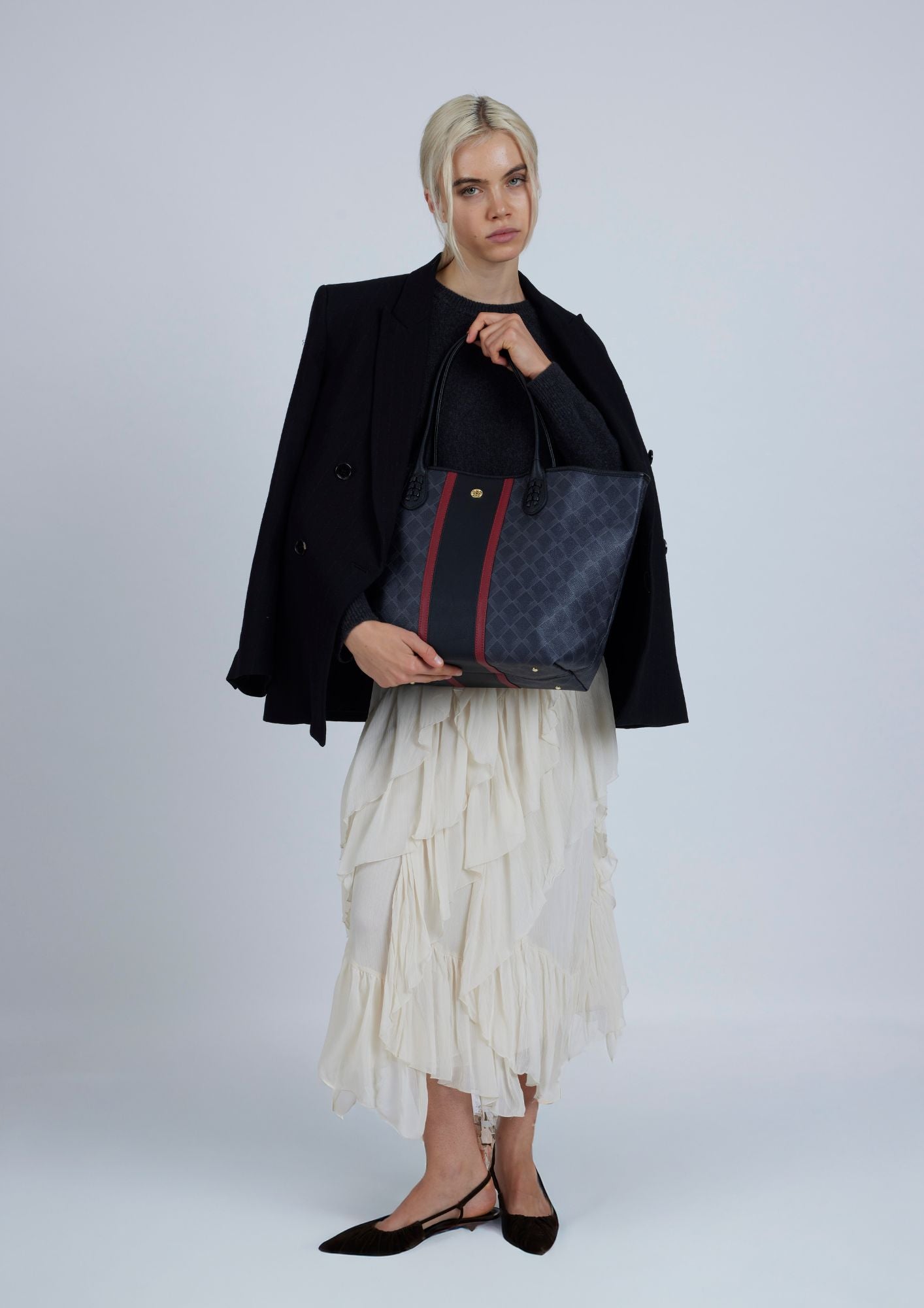 El bolso shopper estampado de la línea Kensington, se distingue por ser una versión exclusiva el bolso más icónico de Lonbali. Se caracteriza por tener una franja central que le da personalidad. Tiene un diseño atemporal y es muy versátil, se caracteriza por su gran capacidad de almacenaje. Lo puedes llevar en el hombro o cruzado gracias a su bandolera.