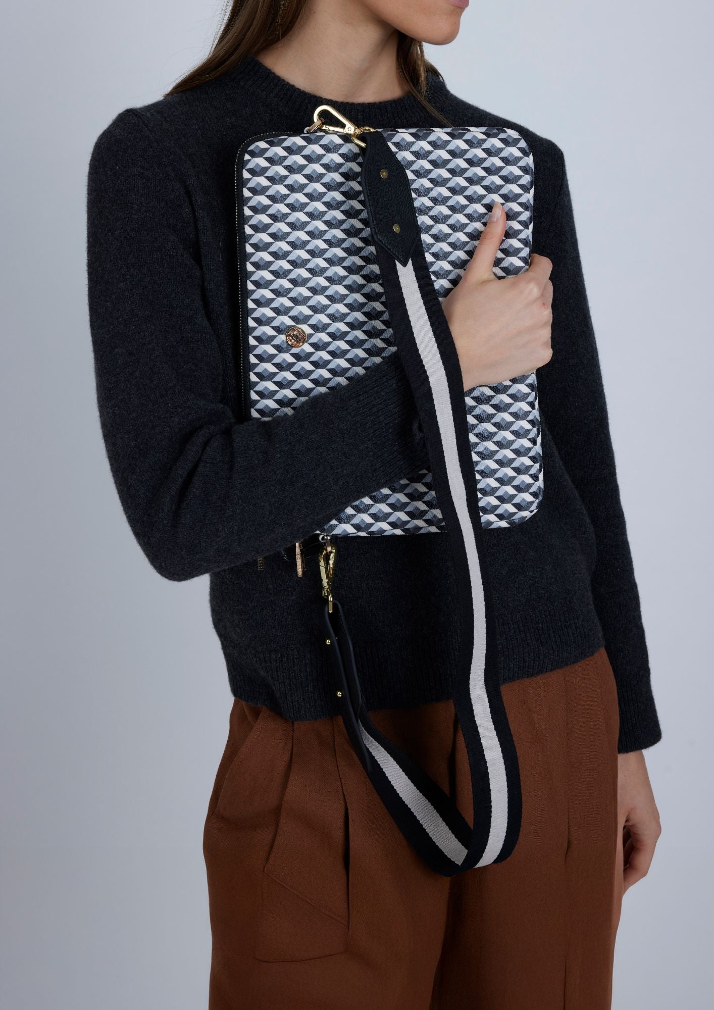 La funda portátil está personalizada con el logo de la marca. Gracias a las arandelas en los laterales, puedes utilizar la correa de tu bolso Lonbali u otras para llevarla cómodamente colgada al hombro.