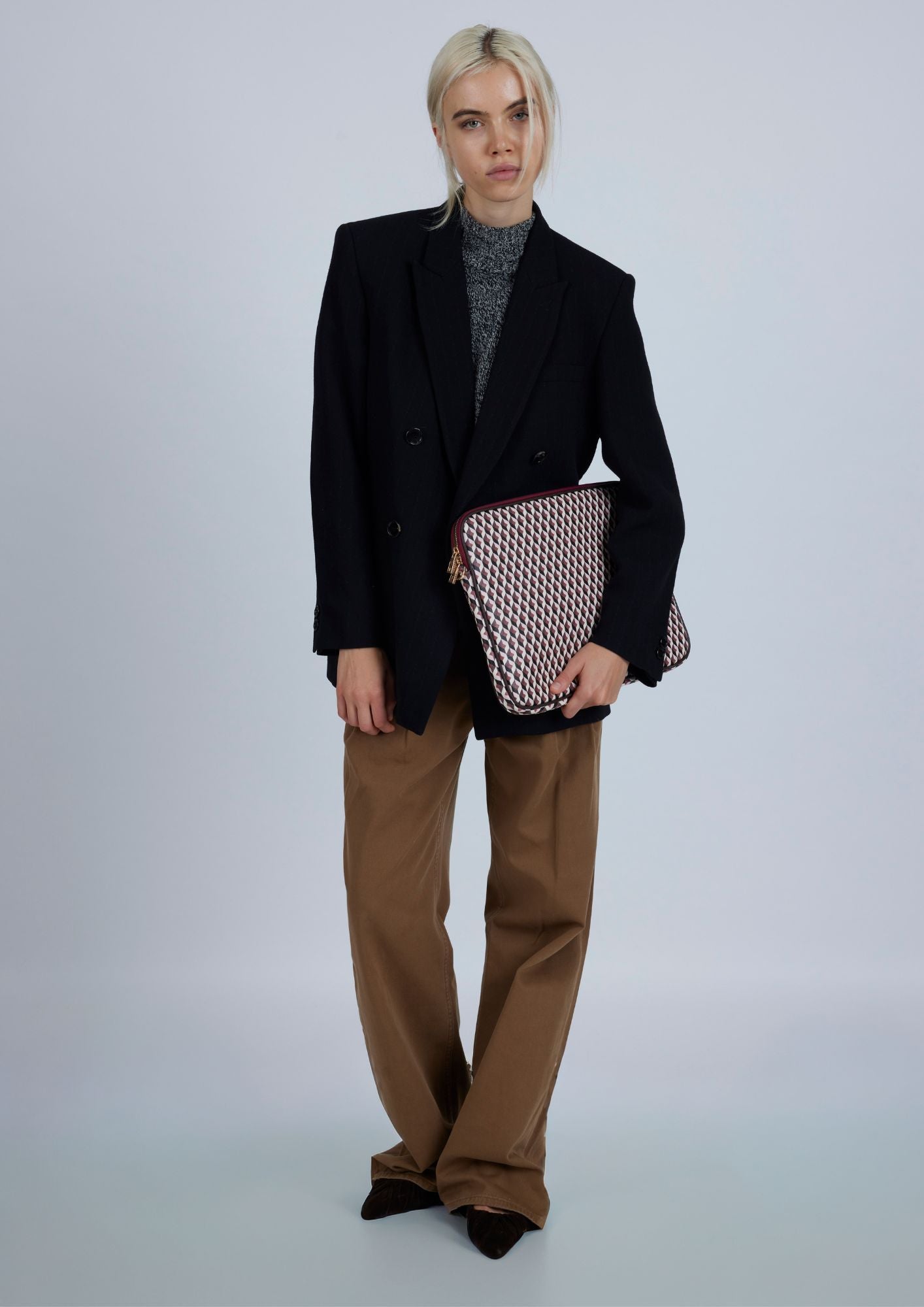 Se cierra completamente con cremallera y tiene un bolsillo extra con cremallera en la parte trasera. Su interior acolchado ayuda a prevenir golpes y arañazos. Personalizado con el logo de la marca, sobre un estampado en tonos rosados.