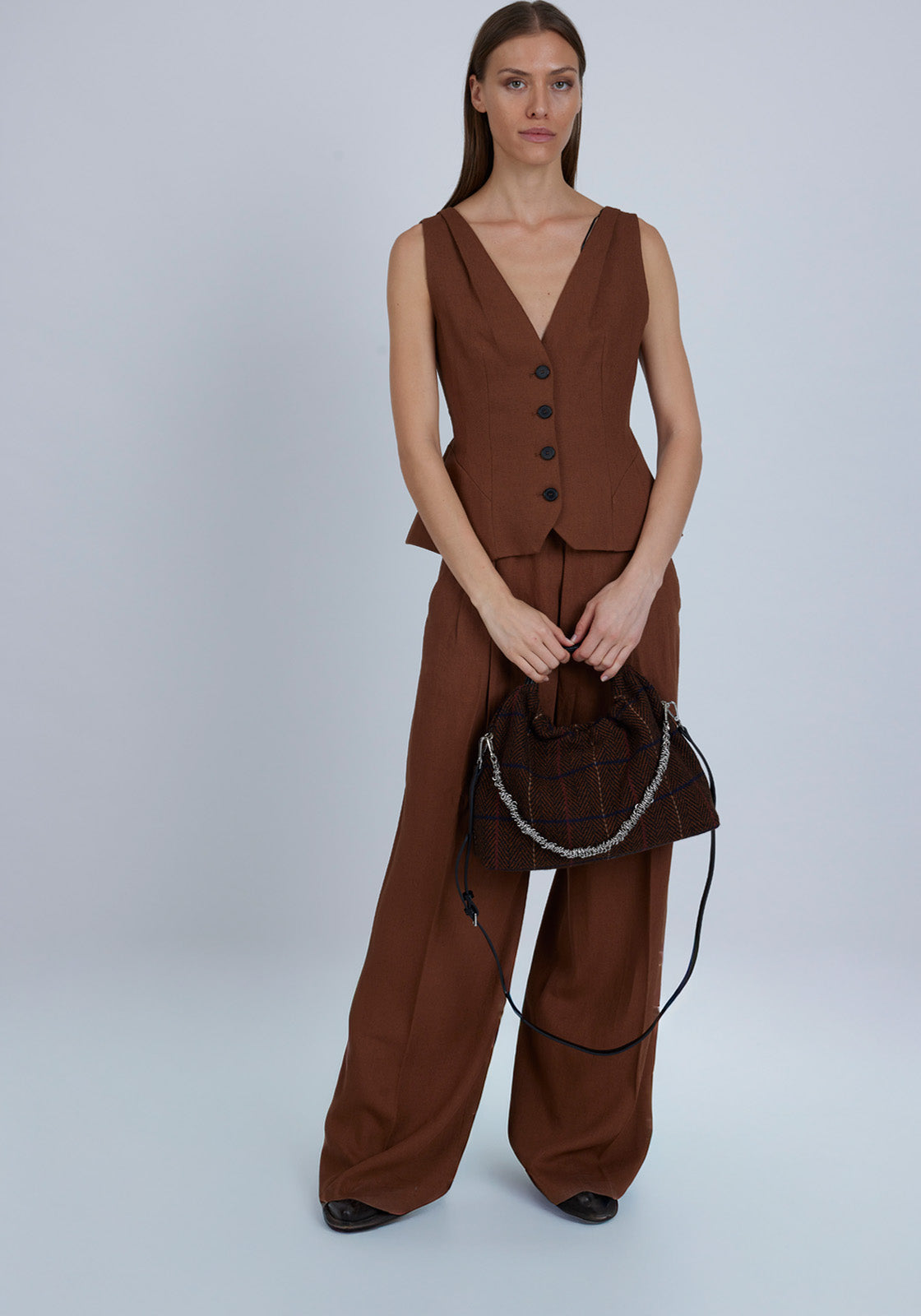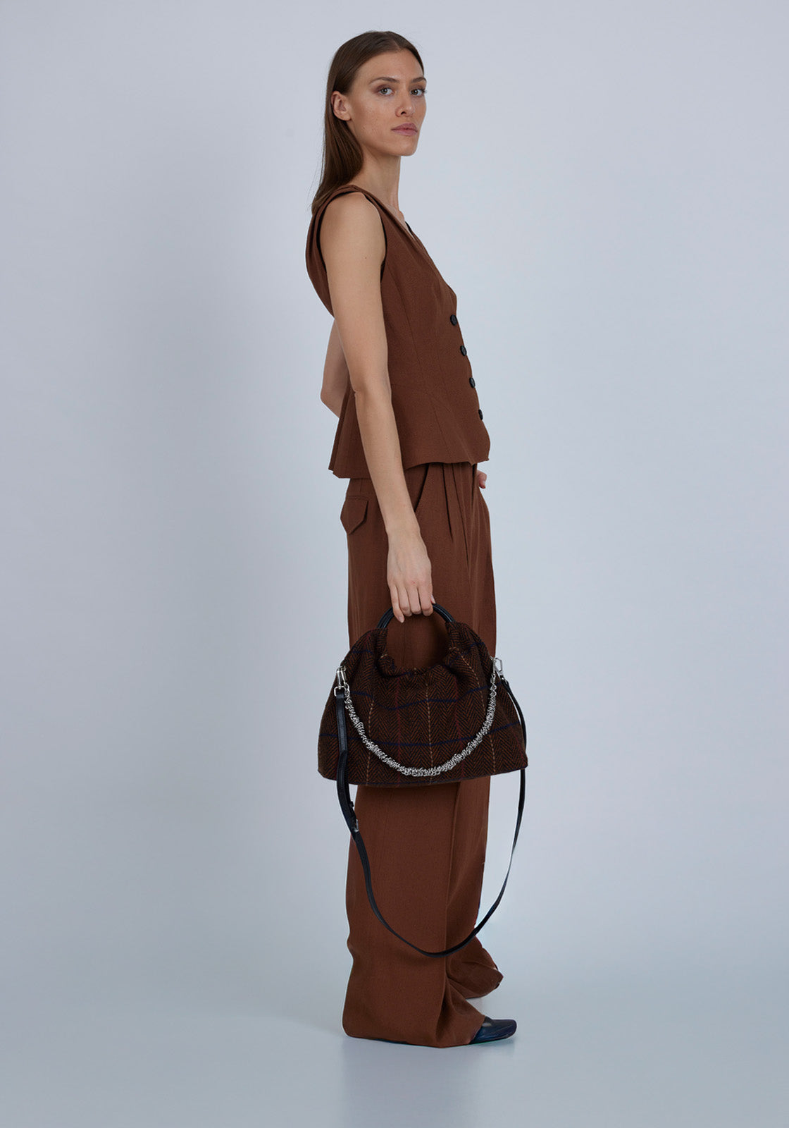 Su característica asa fruncida aporta estilo y comodidad al llevarlo en la mano, mientras que la bandolera desmontable con detalle metálico en forma de cadena elástica permite transformarlo en un bolso cruzado con mucha personalidad. Su interior espacioso lo convierte en el compañero perfecto para tu día a día o para una salida nocturna con estilo.